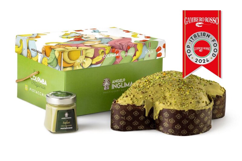 Realizzata ad hoc per la Pasticceria Angelo Inglima, l’originale confezione rende la colomba al pistacchio uno splendido omaggio dalla Sicilia.