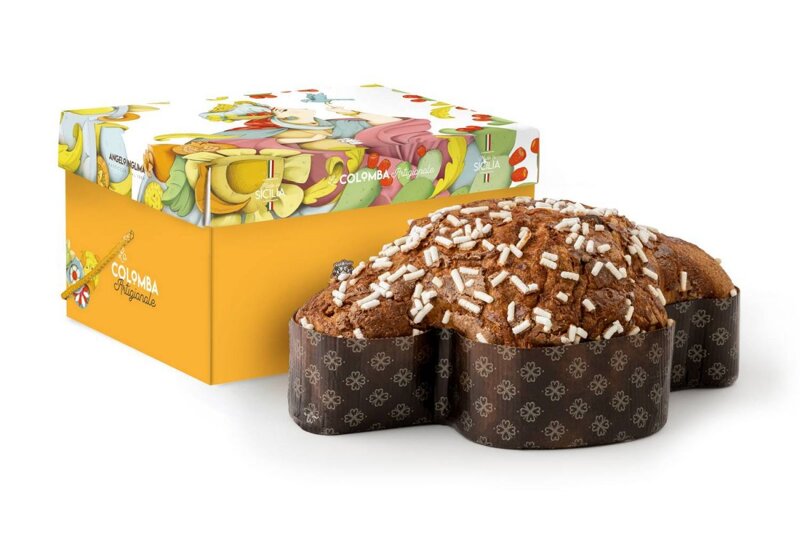 La copertura della colomba è una golosa glassa con mandorle e granella di zucchero.